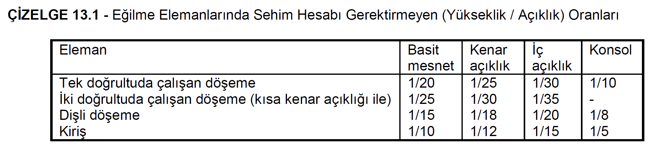 Eğilme elemanlarında izin verilebilecek sehim sınırları, serbest açıklığa bağlı olarak Çizelge 13.3 de verilmiştir.