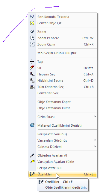 Ayarlarına girmek istediğiniz serbest çizgiyi seçin farenin sağ tuşuna tıklayarak açılan menüden Özellikler satırına tıklayın.