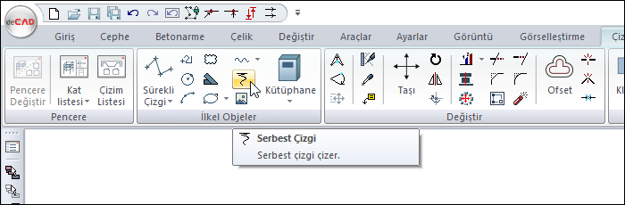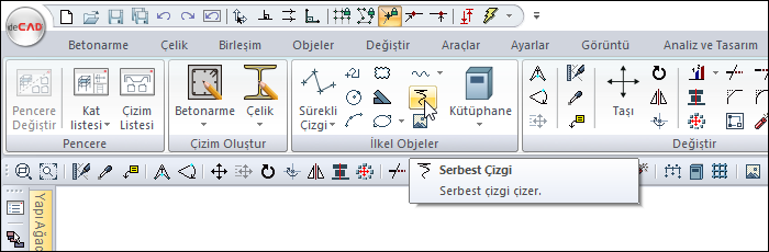 Serbest çizgi komutuyla, mimari ve statik proje tasarımlarında elle çizim yapar gibi bilgisayar ekranında çizgi çizilir.