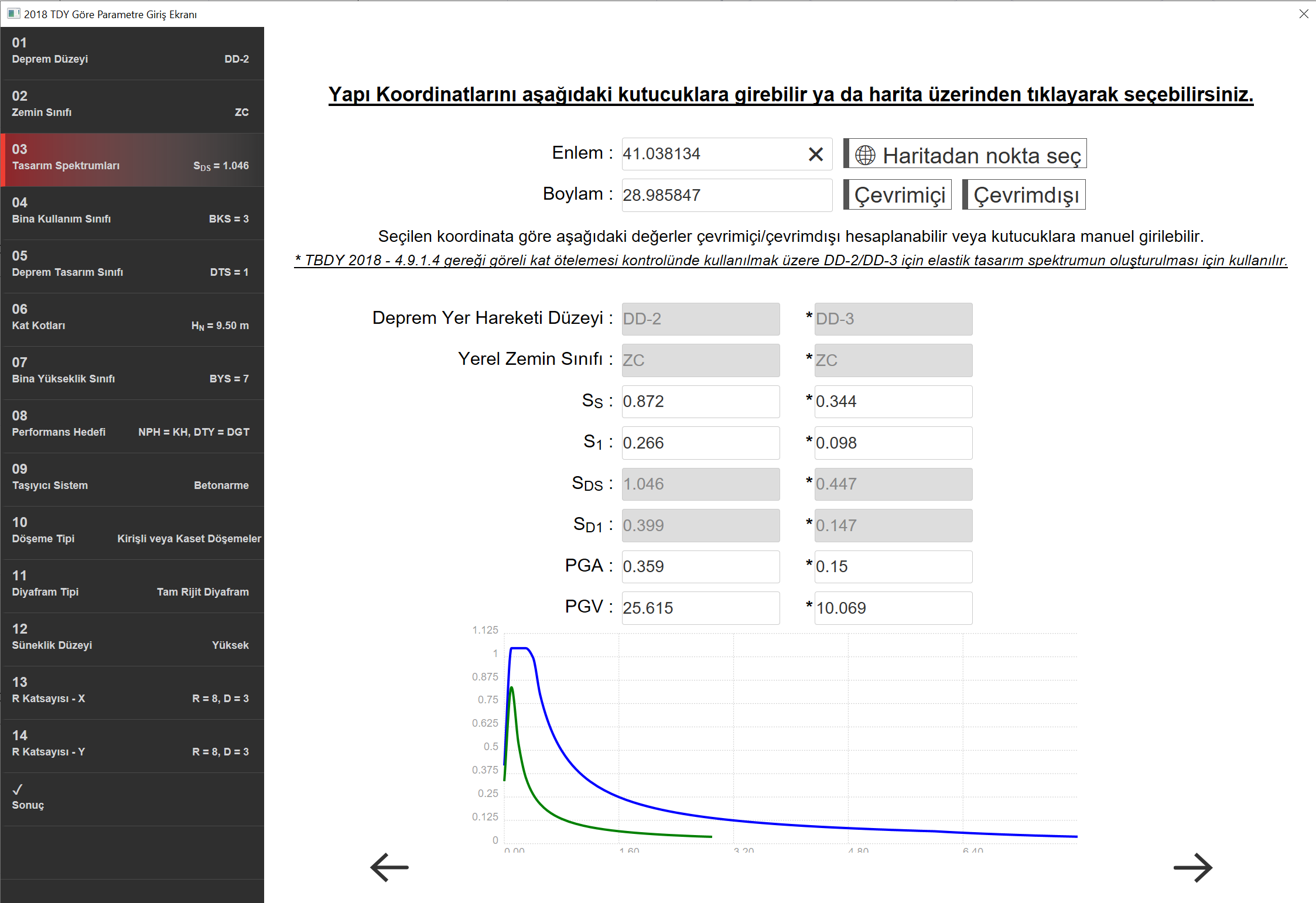 Yatay elastik tasarım spektrumu için değerler aşağıda verilmiştir.