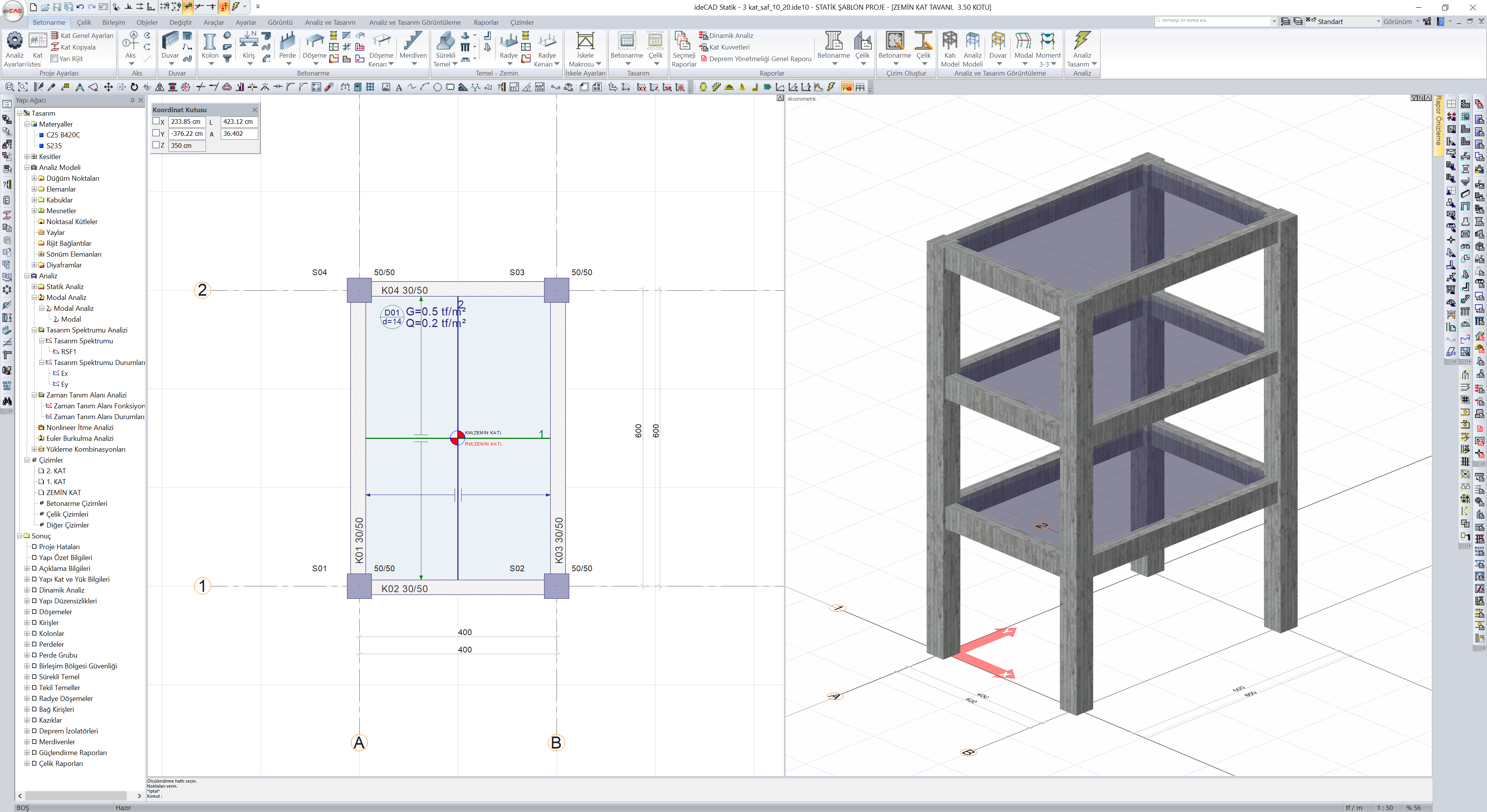 Kolon Boyutları, 50x50 Kiriş Boyutları, 30x50 Kat yüksekliği, 3m Kat sayısı, 3
