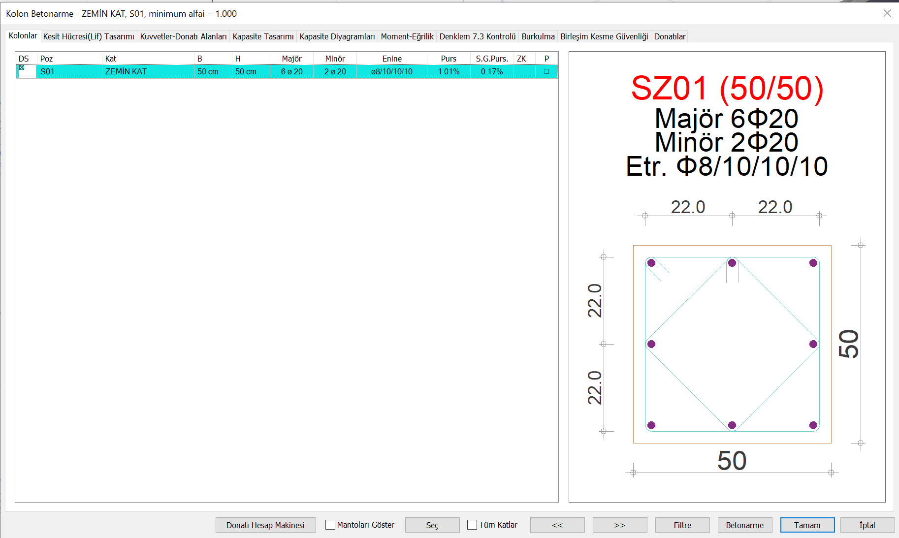 Kolon donatıları 8Φ20 olarak aşağıdaki gibi düzenlenmiştir.