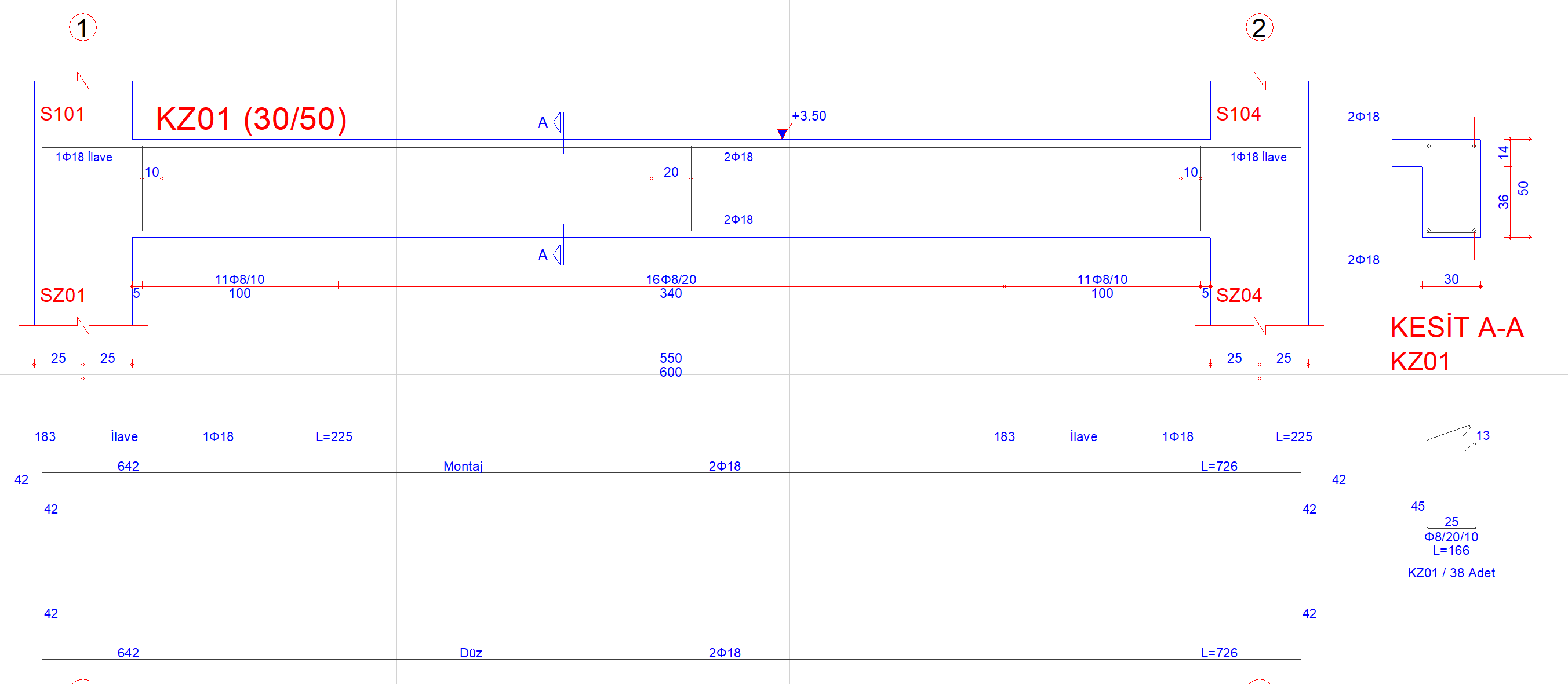 Kiriş donatıları mesnetlerde üst donatı 3Φ18, alt donatı 2Φ18 olacak şekilde düzenlenmiştir.