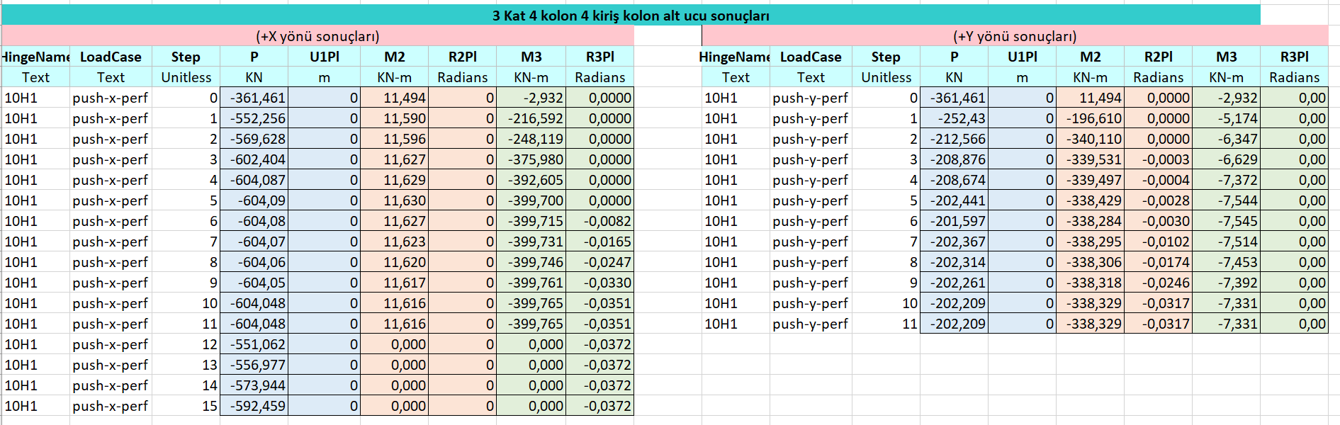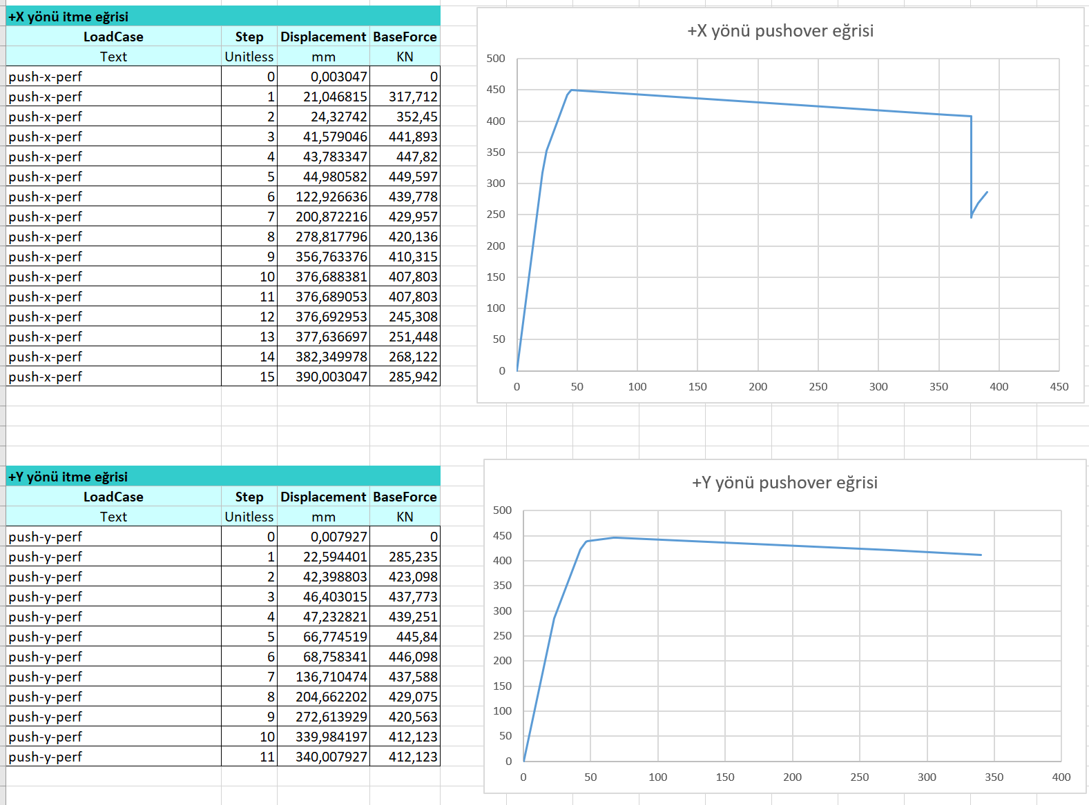 Tek modlu itme analizi yapıldığında +X ve +Y yönü için taban kesme kuvveti-tavan yerdeğiştirme değerleri aşağıda verilmiştir