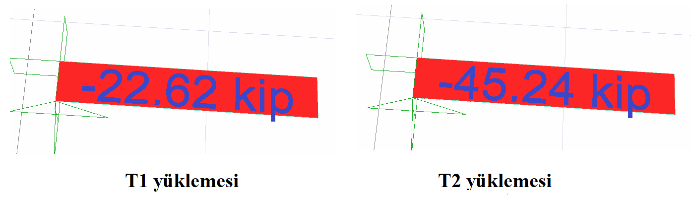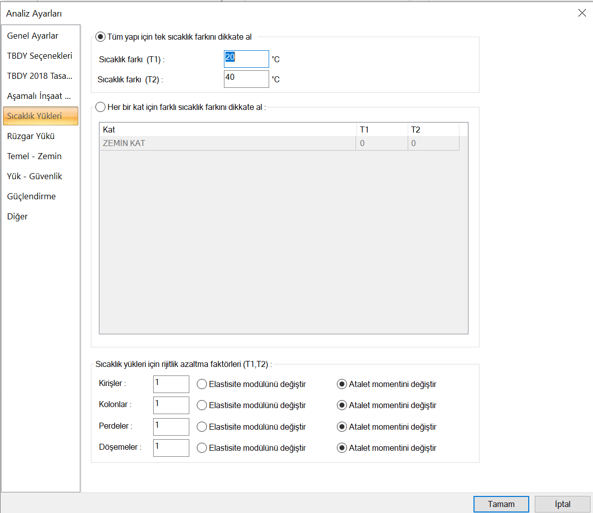 Yükleme durumu için T1=20 oC ve T2 = 40 oC olmak üzere iki farklı sıcaklık farkı oluşturulmuştur. Sıcaklık yükleri için azaltma faktörü kullanılmayacaktır.