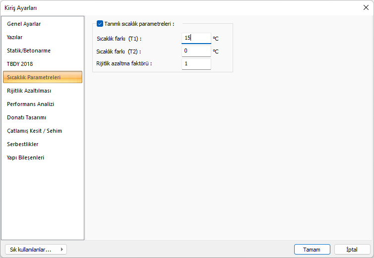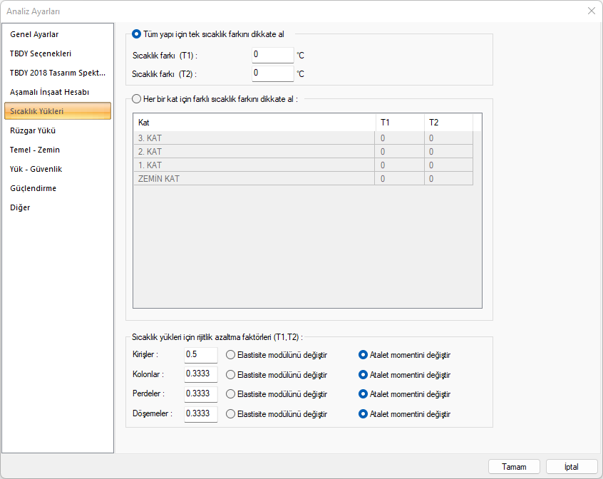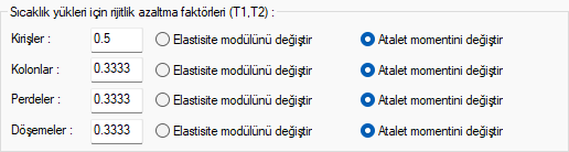 ideCAD de sıcaklık hesabında “Sıcaklık yükleri için rijitlik azaltma faktörleri” opsiyonu ile eğilme rijitlikleri (EI) azaltılabilir. ideCAD’deki mevcut değerler kirişler için EcIc/2, kolonlar için EcIc/3 olarak TS500 ve literatürdeki kaynaklara uygun olarak atanmıştır. Rijitlik azaltması atalet momenti veya elastisite modülü kullanılarak yapılabilir. Sıcaklık yükü ile sünme hesabın yapılmak istenirse elemanların eksenel rijitliğinin önemli olduğu durumlarda bu seçenek kullanılarak elastisite modülünün azaltılması gerekmektedir.