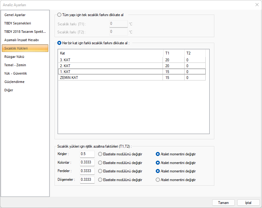 Bütün yapı aynı sıcaklık farkına maruz kalıyorsa “Tüm yapı için tek sıcaklık farkını dikkate al” opsiyonu kullanılabilir. İki farklı sıcaklık yükü tek seferde tanımlanarak iki farklı sıcaklık durumu çözülebilir.
