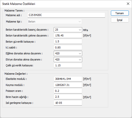 Tanımlanması gereken diğer parametre ısıl genleşme katsayısıdır. TS500 3.3.3.4 ‘e göre betonun ısıl genleşme katsayısı ΔT=10-5/°C alınmalıdır. Bu değer doğrudan sıcaklık ile çarpılarak betonun birim şekildeğiştirmesini vermektedir.