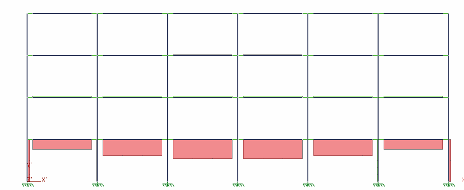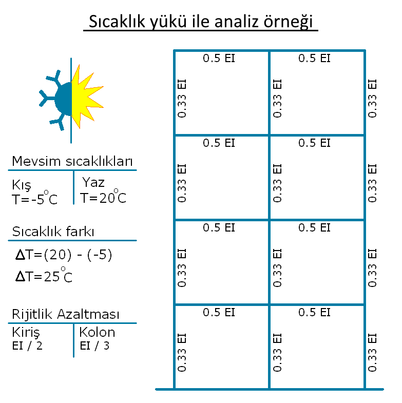 Örnek model olarak 4 katlı planda 30m uzunluğa sahip çerçeve sistem seçilmiştir. Sıcaklık yükü mevsimsel olarak şekilde görüldüğü gibi seçilerek ilk çözümde bütün bina için tek bir sıcaklık farkı tanımlanarak hesaplanmıştır.