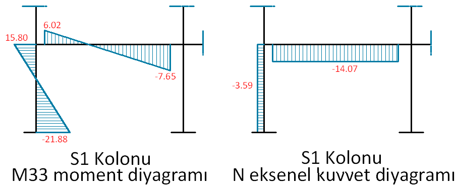 Şekilde köşe kolon ve kirişin moment ve eksenel kuvvet değerleri görünmektedir.