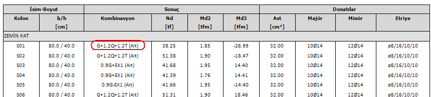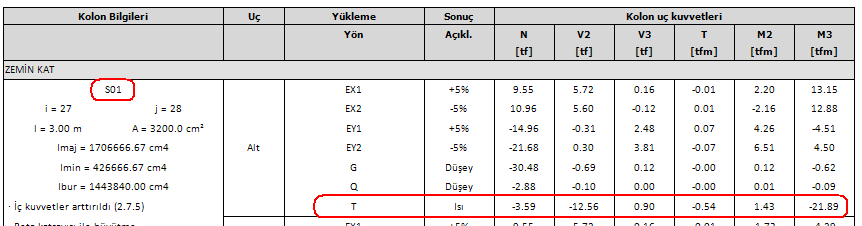 Kolon betonarme hesap sonuçları raporunda bazı kolonlar için donatı hesabına esas tesirlerin ısı yüklemesi kombinasyonlarından geldiği görülebilir.