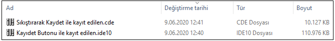 Aşağıda ekran görüntüsü görünen örnek projede Sıkıştırarak Kaydet ile Proje Kaydet arasındaki fark gösterilmiştir.