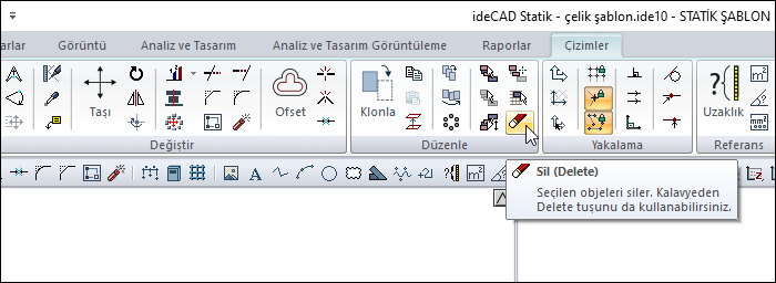 Sil komutuna Çizimler sekmesi Değiştir başlığı altından ulaşabilirsiniz.