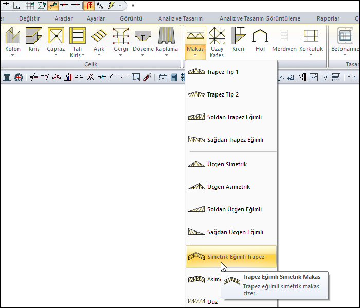 Simetrik Eğimli Trapez komutuyla, hazır makas tiplerinden biri olan simetrik eğimli trapez makas tipi hızlı bir şekilde çizilir. Makas ayarlarından makas yükseklikleri ayarlanır.