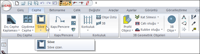 Söve komutuyla kapı ya da pencere elemanlarına söve tanımlanır. Söve çizmek için projede önce kapı/pencere elemanları tanımlanmalıdır.