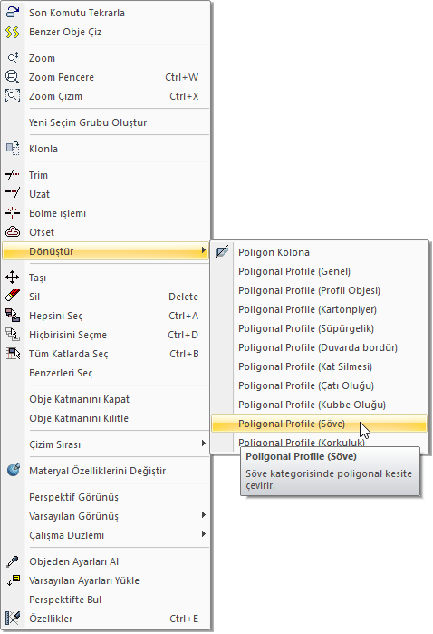 Açılan menüden Dönüştür/Poligonal Profile (Söve) satırını tıklayın.