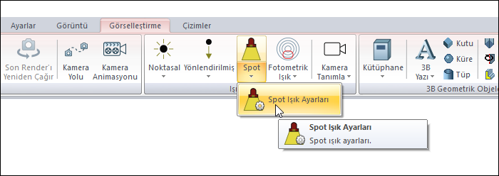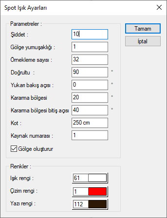 Spot Işık Ayarları komutuyla ışık kaynağının şiddeti, doğrultusu, açısı, kotu, ışık rengi gibi ayarlarına ulaşılır.