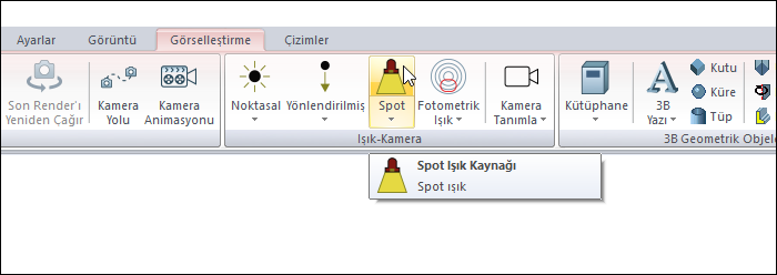 Spot Işık Kaynağı komutu ile spot ışık kaynağı tanımlanır. Işık rengi, kotu, doğrultusu ve şiddeti değiştirilir.