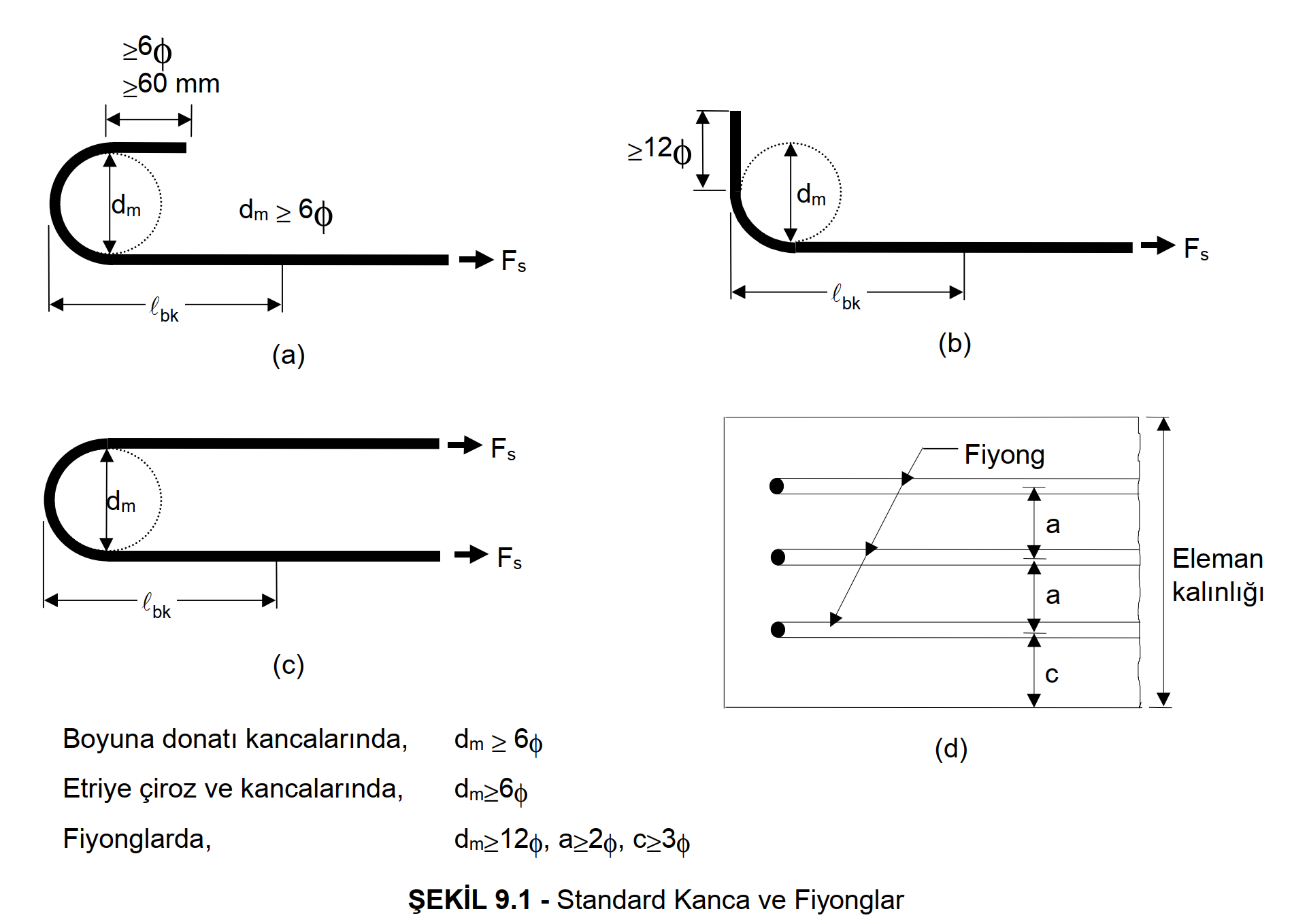 Fiyong - Fiyong Şekil 9.1c de gösterilmiştir. Fiyongların bükülme iç çapı, dm, 12φ den az olamaz.