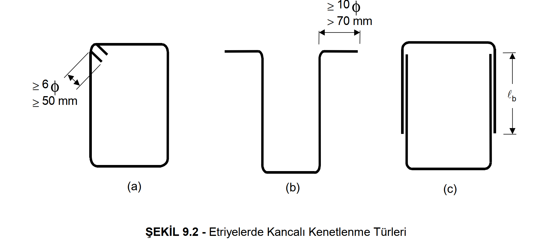 90o bindirmeli kanca - Bu tür bindirmeli kanca Şekil 9.2c de gösterilmiştir. Bindirmeli etriyelerde bindirme boyu, Denklem 9.1e göre hesaplanan kenetlenme boyuna eşit alınmalıdır. Deprem bölgelerinde yapılacak olan yapılarda bu tür etriye kullanılamaz.
