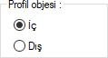 Profil Objesi ![]() İç ve dış seçenekleri ile süpürgeliğin kesite göre pozisyonu ayarlanır. Dış işaretlenirse, süpürgelik kesitin dış kenarı temel alınarak, iç işaretlenirse iç kenarı temel alınarak çizilir. |