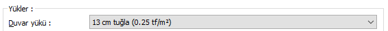 Duvar yükü ![]() Listeden uygun duvar yükünü seçebilirsiniz. Listedeki duvar yükleri yük kütüphanesinde tanımlanmış yüklerdir. Bu değerlerden farklı bir değeri duvar yükü olarak belirtmek isterseniz, listeden kullanıcı tanımlı satırını seçip açılan diyalogdan uygun değeri girebilirsiniz. Ayrıca yük kütüphanesine kendinizde yeni duvar yükleri ekleyebilirsiniz. |