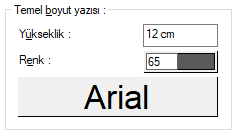 Temel isim yazısı Yükseklik, Renk ve Yazı tipi ![]() Sürekli temel adı yazısının yüksekliği girilir. Renk kutusu farenin sol tuşu tıklanıp açılan renk paletinden seçilir. Hemen alttaki yazı butonu tıklanırsa, Yazı Tipi Ayarları diyalogu açılır. Bu diyalogdan Kiriş Ad Yazısı, yazı tipi ayarlanır. |