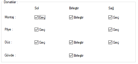 Donatılar ![]() Bu bölümde Montaj, Pilye, Düz, Gövde satırları ve Sol, Birleştir, Sağ sütunları görülür. |