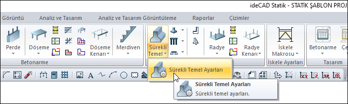 Sürekli Temel Ayarları komutu ile sürekli temel boyutları, yükseklikleri, kot, çizim, materyal seçimi, statik materyal gibi ayarlarına ulaşılır.