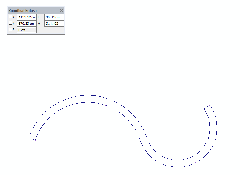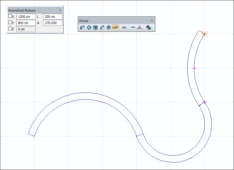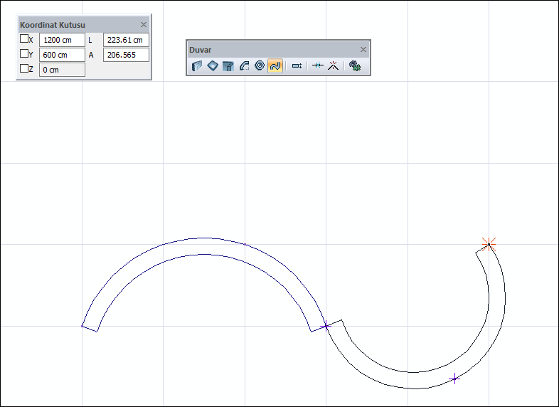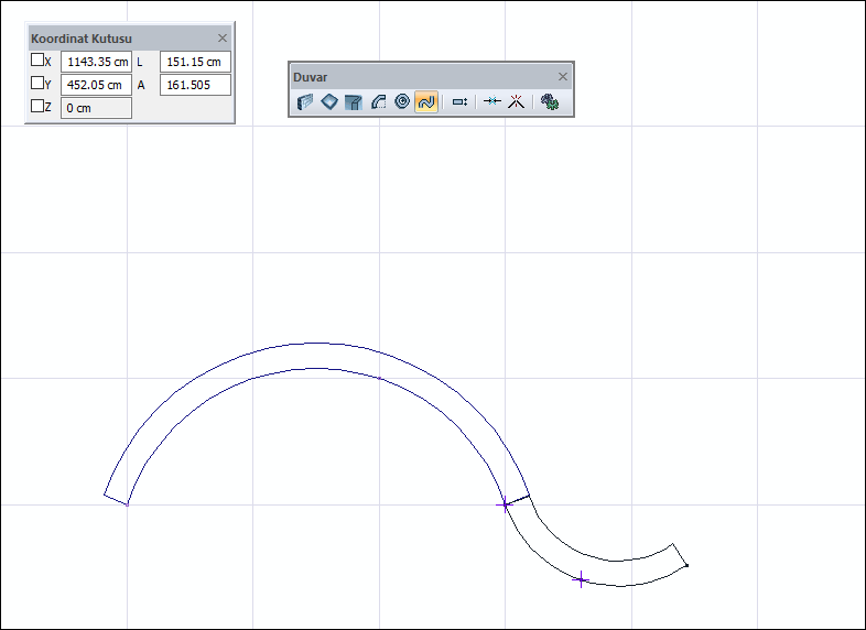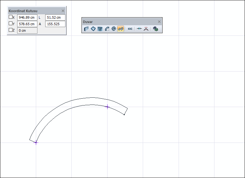 Çizim alanında ikinci noktanızı belirleyin. İkinci noktanızı belirlendikten sonra fare hareket ettirildiğinde yay duvarın ön görüntüsü ekranda belirecek, fare imlecinin hareketine bağlı olarak şekil değiştirecektir.