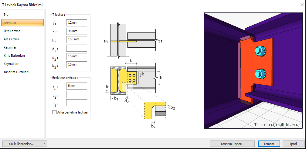 T levhalı kayma birleşimi, profilin gövdesine bulonla ve mesnete kaynakla bağlı olan bir moment aktarmayan birleşim (kayma birleşimi) tipidir. Bulon kontrolü, kaynak kontrolü ve levha kontrolü birleşimin elemanlarının yerleşimine göre otomatik yapılır. Tek kayma levhalı birleşim tasarımı Çelik Yapıların Tasarım, Hesap ve Yapım Esasları (ÇYTHYEDY) (GKT ve YDKT) veya AISC 360-16 (ASD ve LRFD) yönetmeliklerine göre otomatik yapılır ve birleşim raporu oluşturulur.