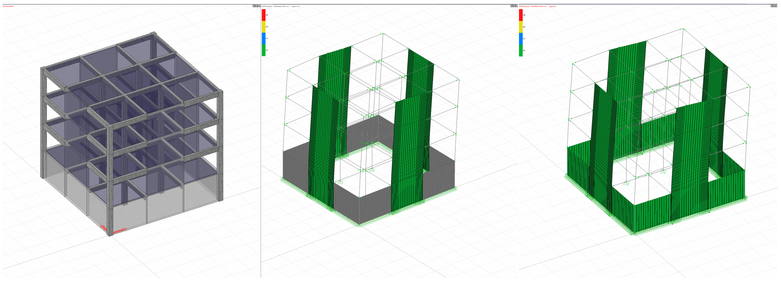 Bodrum perdelerinde kullanıcı inisiyatifinde doğrusal olmayan modelleme tekniği de kullanılabilir. Bodrum perdelerinin doğrusal olmayan modellemesinde Yayılı Plastik Davranış Modeli kullanılır. Aşağıdaki resimde sırasıyla, üç boyutlu yapı modeli, bodrum perdelerinin doğrusal olarak modellenmiş analiz modeli ve bodrum perdelerinin doğrusal olmayan modelleneme kullanılarak oluşturulmuş analiz modeli görülmektedir.