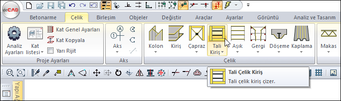Tali Çelik Kiriş komutuyla çelik tasarıma ait tali kirişler oluşturulur. Tali çelik kiriş, çelik kirişler arasına çizilen kiriş elemanlarıdır. Seçilen iki kiriş tıklandıktan sonra ekrana gelen ayarlar diyalogunda, tali kirişlerin kaç adet olacağı, yerleşim düzeni, birleşim özellikleri vb parametreler ayarlanır.