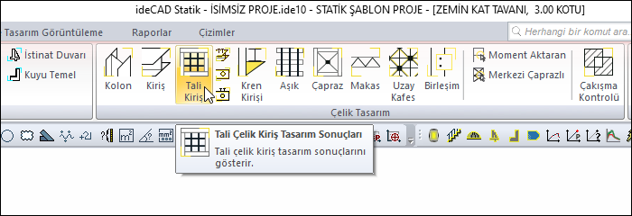 Analiz yapıldıktan sonra, ribbon menü Analiz ve Tasarım sekmesi Çelik Tasarım başlığı altından Tali Kiriş komutuna tıklayarak ulaşabilirsiniz.