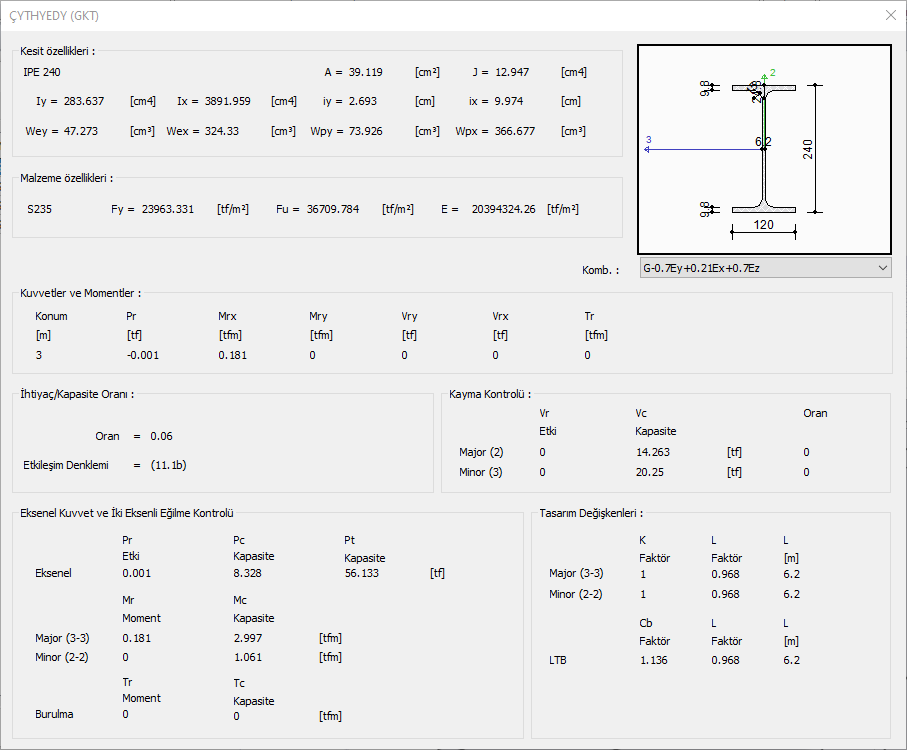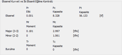 Eksenel kuvvet ve iki eksenli eğilme kontrolü ![]() Çelik tali kirişin eksenel kapasite ve moment kapasitesi oranları gösterilir. |