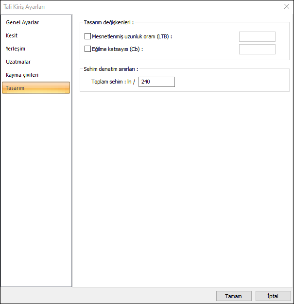 Sehim sınırı | Tasarımda kullanılan ilgili Çelik Yapılar yönetmeliğinde belirtilen eleman bazlı sınır değerdir. Tali kirişin kullanıldığı durumlara göre sınır değerinin kullanıcı tarafından değiştirilmesi gerekmektedir. |