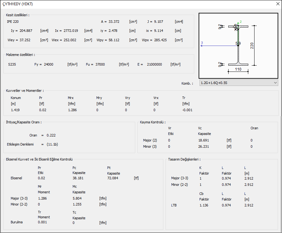 Eğilme katsayısı (Cb) | Moment düzeltme katsayısı, Çelik Yapılar Yönetmeliği Denklem 9.1' e göre hesaplanır. |