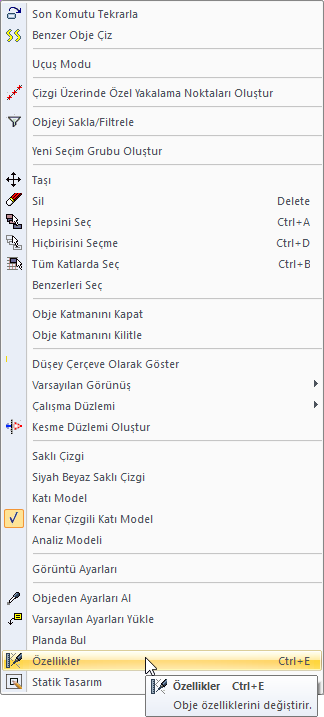 Hızlı çizim modu açık ise oluşan birleşim seçilip farenin sağ tuşuna tıklayın. Açılan sağ tuş menüden Özellikler satırını tıklayın.