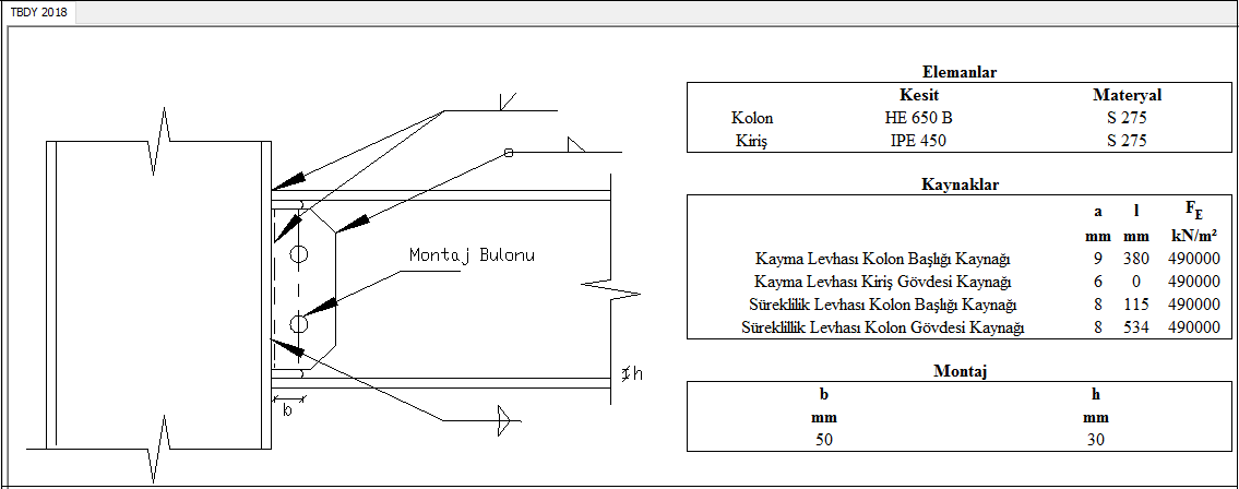 Tam Penetrasyonlu Küt Kaynaklı Birleşim hesabında, geometri kontrolünde kaynak erişim deliği uzunluğu ve yüksekliği, kayma levhası kolon başlığı kaynak kalınlığı, kayma levhası kiriş gövdesi kaynak kalınlığı ve süreklilik levhası kaynak kalınlığı kontrolü yapılır. Dayanım kontrolünde kiriş kayma akması, kayma levhası kolon başlığı kaynak dayanımı, kolon panel bölgesi kayması ve kayma bölgesi kalınlığı kontrolü yapılmaktadır.