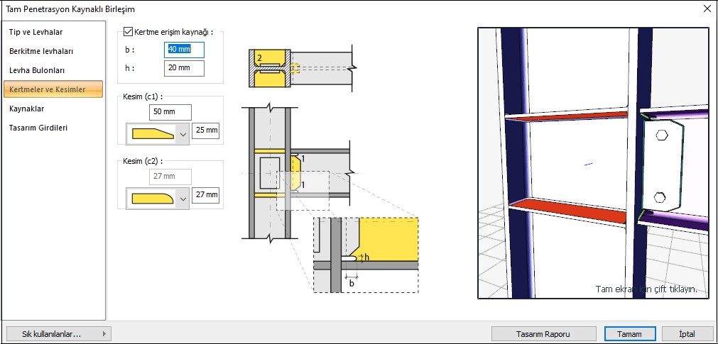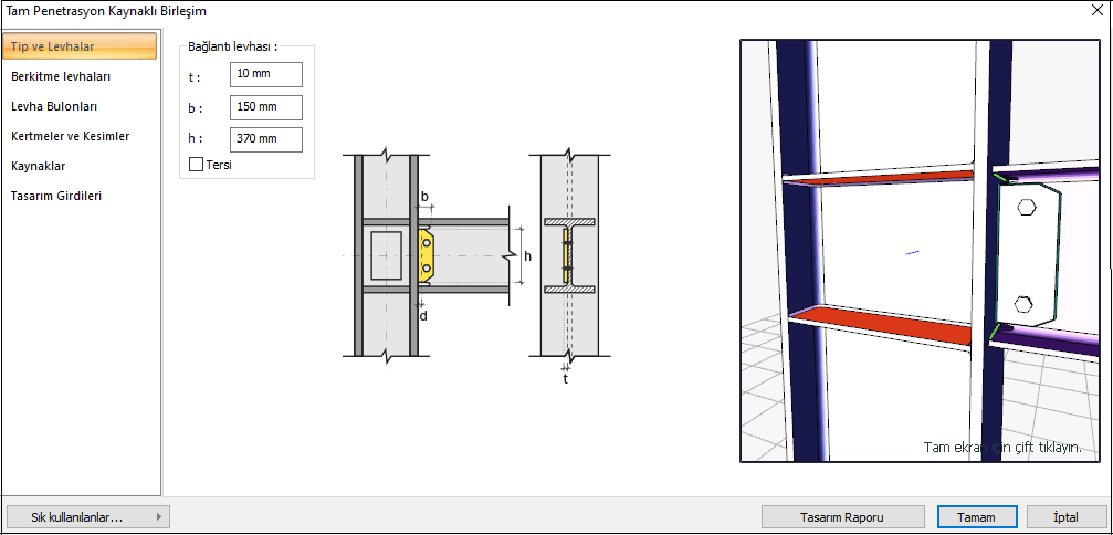 Tam Penetrasyonlu Küt Kaynaklı Birleşim, kolon başlığı - kiriş başlığı tam penetrasyonlu küt kaynak ile, kolon başlığı - kiriş gövdesi kaynaklı ve bulonlu levha ile birleştirilerek oluşturulur. Gövde levhası bulon kontrolü, kaynak kontrolü, levha kontrolü ve birleşim uygulama sınırları kontrolü birleşimin elemanlarının yerleşimine göre otomatik yapılır. Başlık Levhalı Kaynaklı Birleşim tasarımı Çelik Yapıların Tasarım, Hesap ve Yapım Esasları (ÇYTHYEDY) veya AISC 360-16 yönetmeliklerine göre otomatik yapılır ve birleşim raporu oluşturulur. Birleşim detayı uygulama sınırları TBDY Tablo 9B.5 'e göre kontrol edilir.