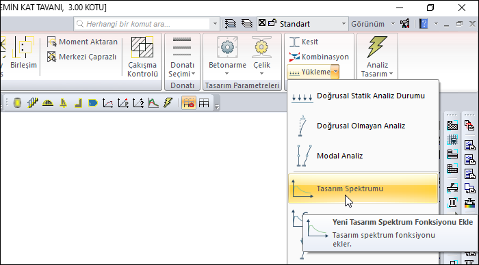 Tasarım Spektrumu komutu kullanılarak Yatay Elastik Tasarım Spektrumu fonksiyonu eklenir. Deprem etkileri, yatay elastik tasarım spektrumu kullanılarak yapılan modal analiz ile hesaplanır. Deprem yönetmeliği seçeneğine göre spektrum eğrisi fonksiyonu değişir.