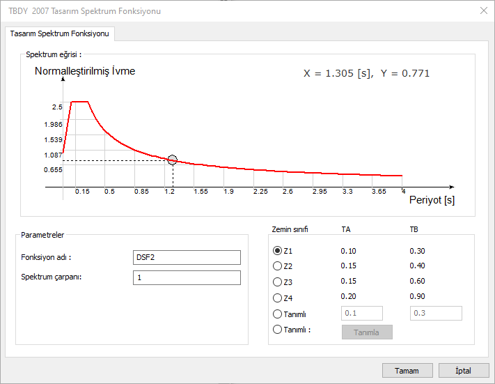 Ayrıca diyalogda bulunan parametreler değiştirilebilir. Seçilen zemin sınıfına göre spektrum eğrisi belirlenir.