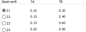 Zemin sınıfı ![]() Spektrum eğrisini belirleyen yerel zemin sınıfları yapınızın oturduğu zemine göre belirlenir. Seçilen zemin sınıfına göre spektrum eğrisi yenilenir. |