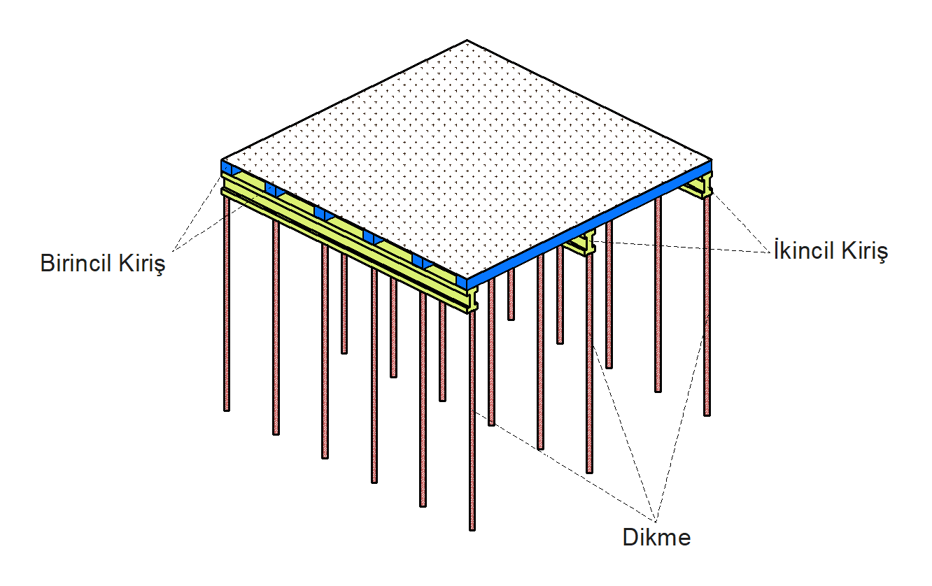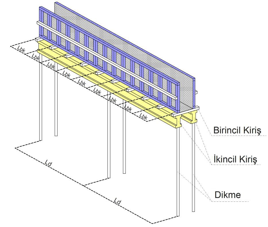 Kiriş kalıplarının dikmeleri her ikincil destek kirişinde olacaktır. Dikme Aralıkları, Ld ,