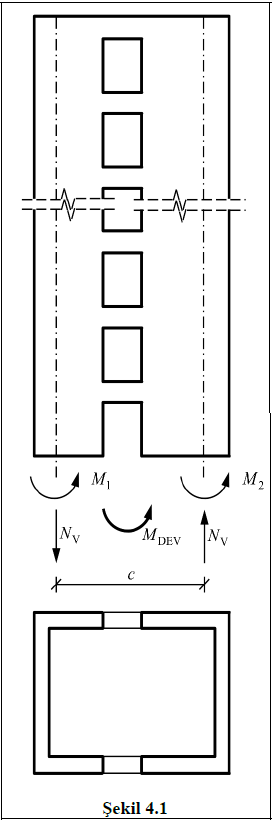Burada MDEV bağ kirişli (boşluklu) perdenin tabanındaki toplam devrilme momentini, M1 ve M2 bağ kirişli perdeyi oluşturan perde parçalarında deprem etkisinden tabanda elde edilen eğilme momentlerini, NV ise deprem etkisinde bağ kirişlerinde oluşan kesme kuvvetlerinin, tüm perde yüksekliği boyunca toplamı olarak, perde parçalarının tabanında oluşan birbirine eşit çekme ve basınç eksenel kuvvetlerine karşı gelmektedir. c, perde parçalarının enkesit ağırlık merkezleri arasındaki uzaklığı göstermektedir.