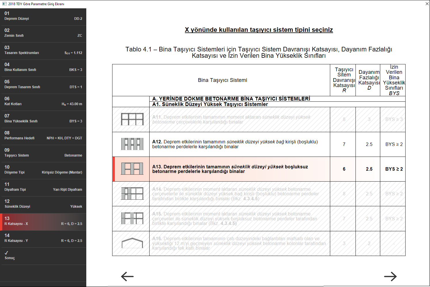 Binanın taşıyıcı sistemi kirişsiz döşeme ve perdeler ile oluşturulmuştur. TBDY 2018 4.3.4.4 gereği kirişsiz döşemeleri içeren taşıyıcı sistemlerde, deprem etkilerinin tamamının süneklik düzeyi yüksek boşluklu ve/veya boşluksuz perdeler veya süenkilik düzeyi sınırlı boşluksuz perdeler tarafından karşılanması gerekir. Binanın BYS=3 olması ve süneklik düzeyi yüksek seçiminden dolayı taşıyıcı sistem tipi için A12 veya A13 taşıyıcı sistemlerinin seçilmesi gerekir.