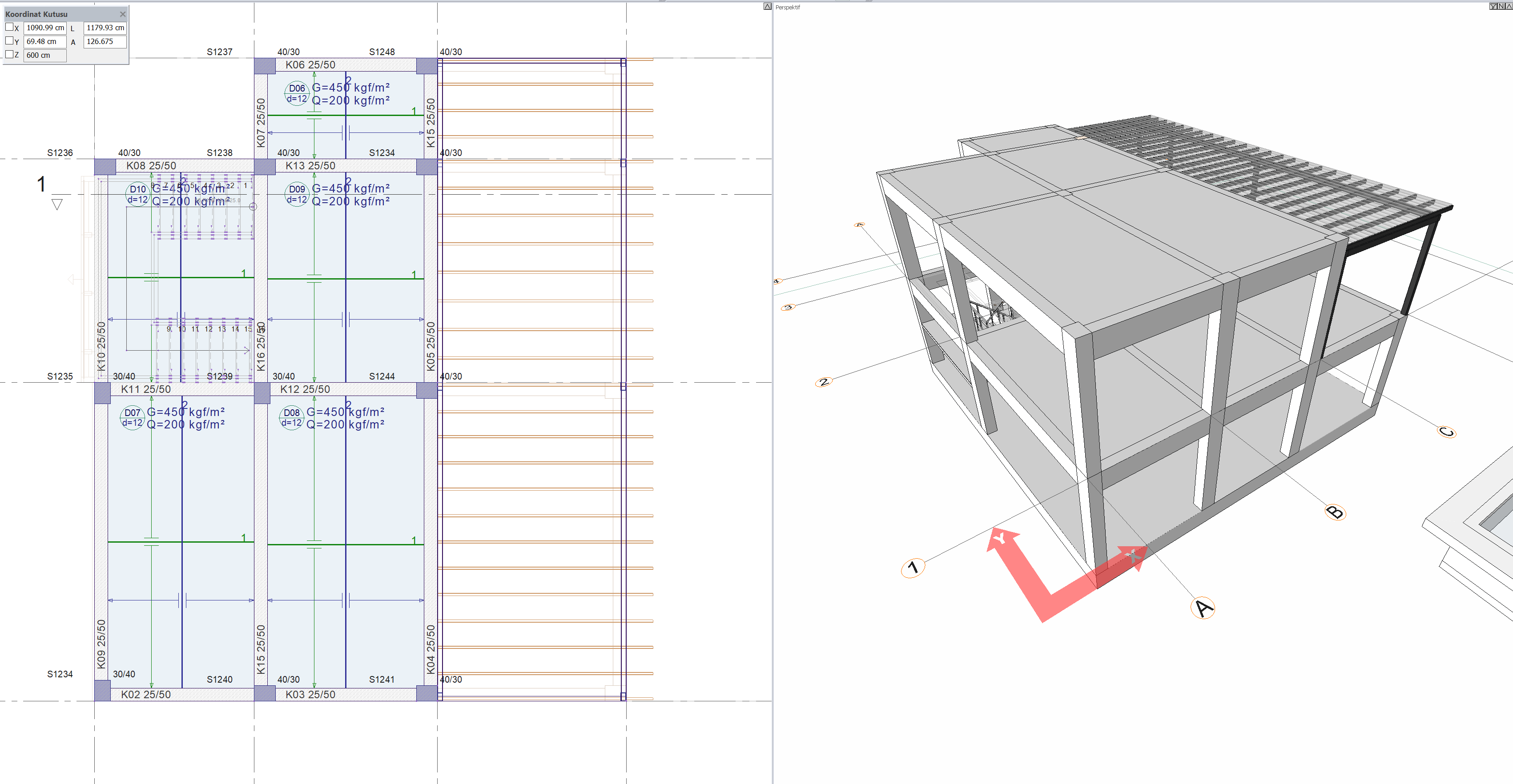 1-2 ve C-D aksları ile sınırlanan alanın üzerine farenizi götürün ve sol tuşuna tıklayın.