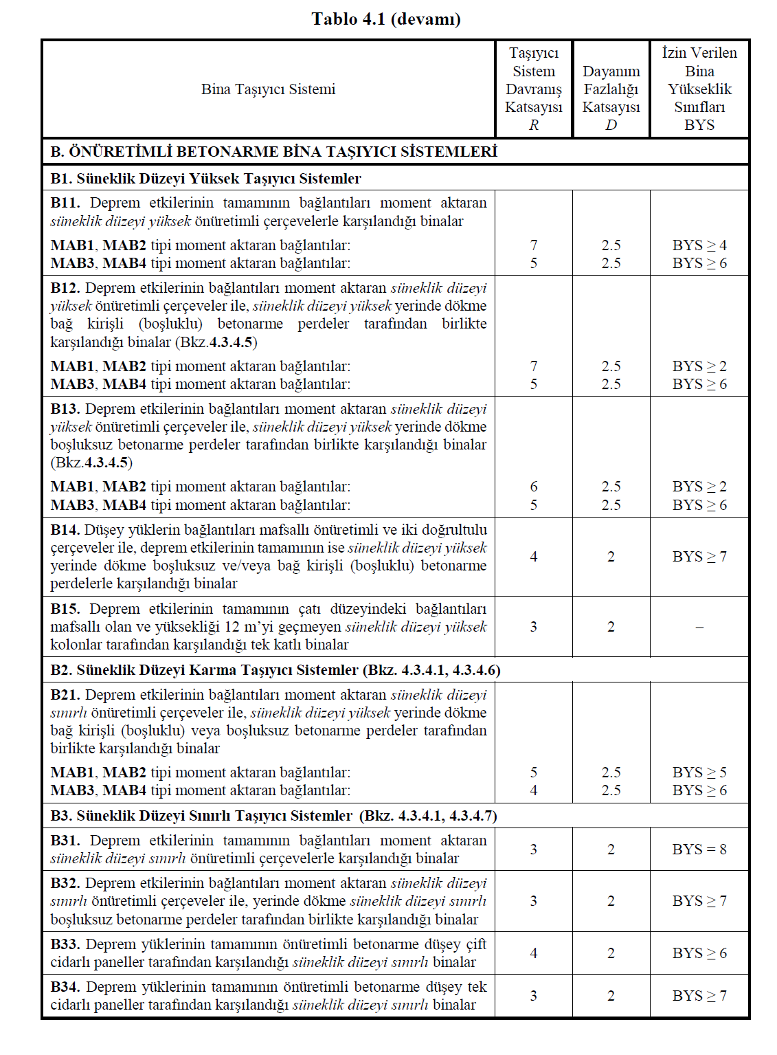 Bu koşulun sağlanamaması durumunda, Tablo 4.1 ’de deprem etkilerinin tamamının süneklik düzeyi sınırlı çerçevelerle karşılandığı durumlar için tanımlanan R ve D katsayıları ile izin verilen en üst BYS dikkate alınacaktır.