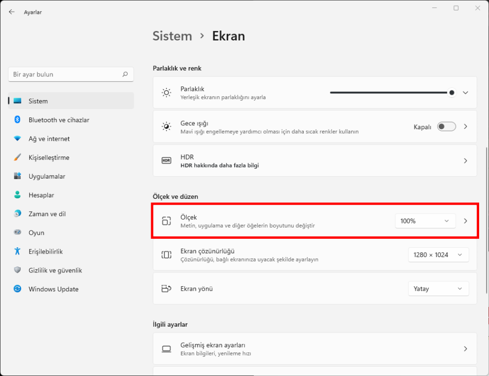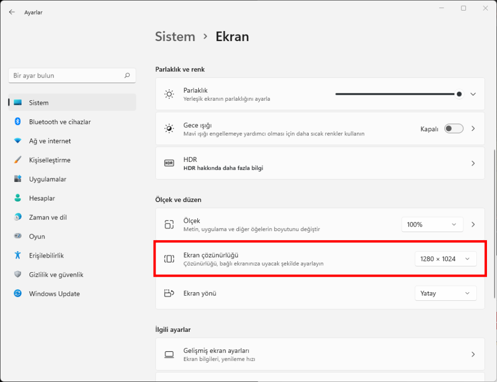 Görüntü ayarlarından ekran çözünürlüğünü kontrol edin.