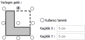 Yerleşim şekli ![]() Çaprazın kendi eksenine göre plandaki kaçıklığını belirleyen seçeneklerdir. Çaprazın aks üzerine yerleşiminde 9 farklı kaçıklığın ayarlanmasını sağlar. Çapraz kesitine göre gösterilen şemada ilgili seçeneği işaretleyin veya kullanıcı tanımlı bölümde herhangi bir sayısal değer girin. |